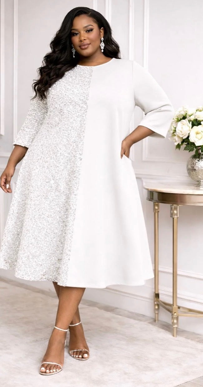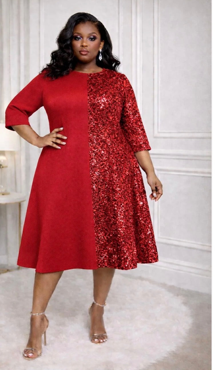 •two toned design A-line cut•scuba stretch and sequence•3/4 sleeves•midi length